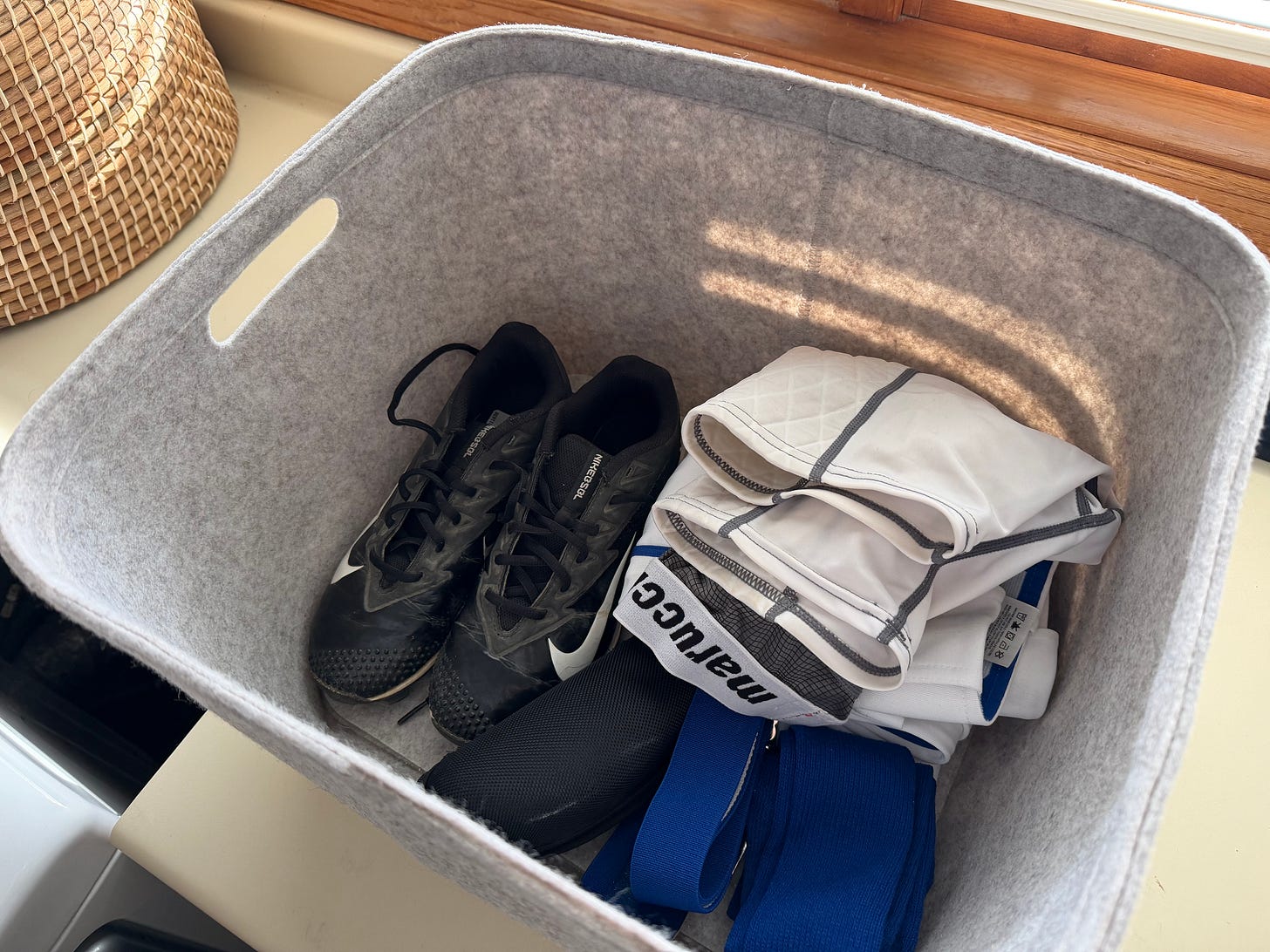 So grateful we implemented the sports basket system for baseball and soccer (not hockey because too much gear - that airs out in the basement). A sports basket houses everything needed for the current sport. I wash their uniforms and put them directly back into their baskets. The baskets live in our mudroom. No more searching for gear all around the house or wondering where we stored something. It’s all in the basket.