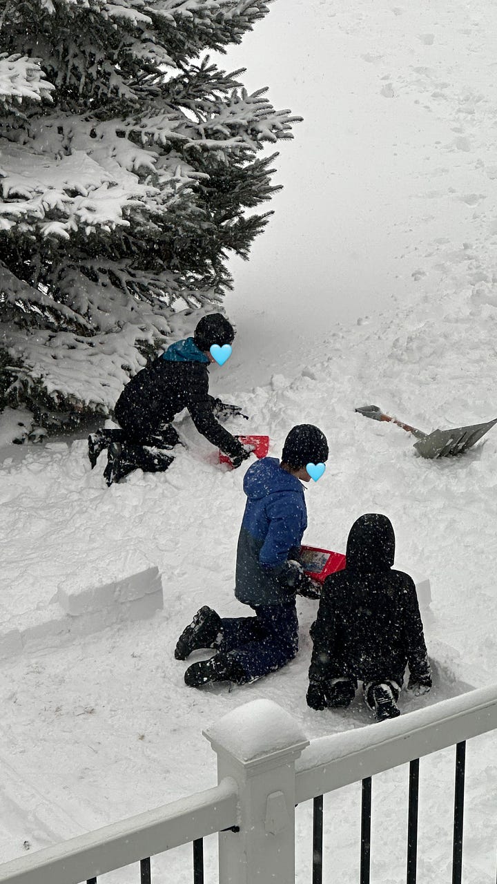 this photo my friend/neighbor sent me of our tweens playing outside for hours in a blizzard last weekend