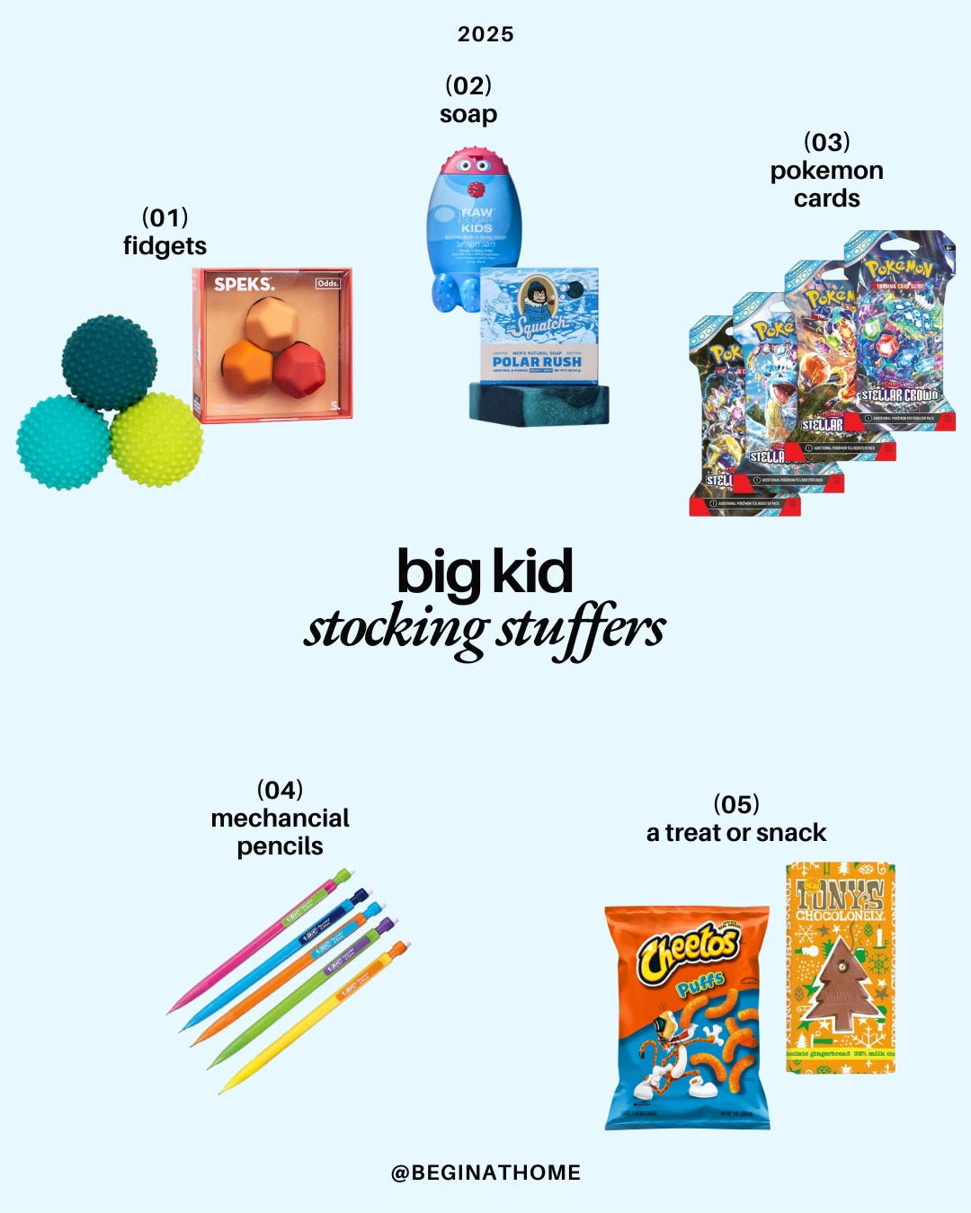 fidgets // raw sugar kids soap // dr squatch soap // pokemon cards1 // mechanical pencils (all the rage in 5th grade apparently) // snack and/or a treat