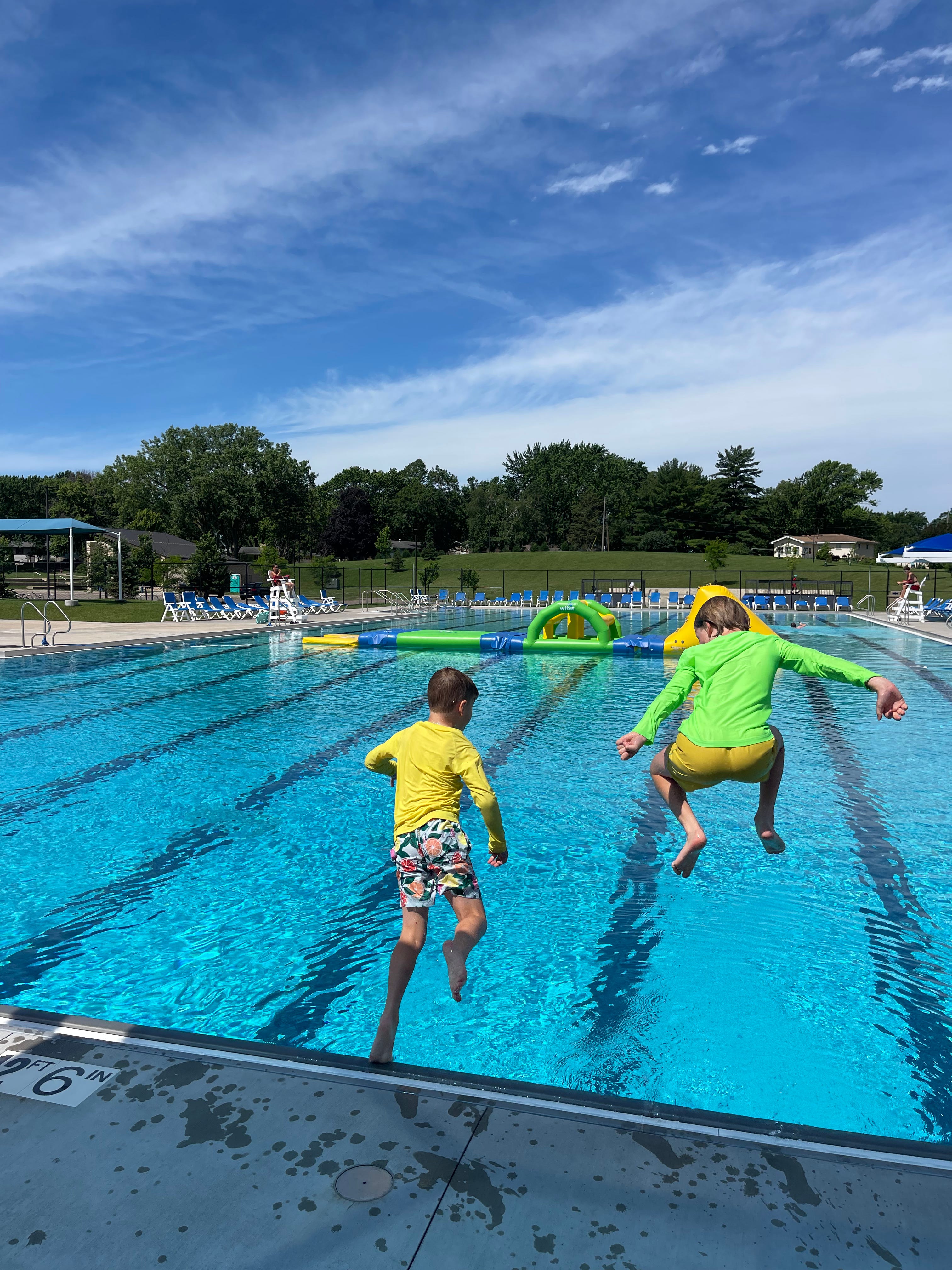 We went with friends/neighbors and also each of my boys were able to bring friends from school occasionally. Our kids became stronger swimmers and learned how to dive. They both started the summer nervous about the high dive and ended summer doing fancy jumps off of the high dive. It was fun to see tons of people we knew from school and sports there. I loved hours of poolside chats with friends, cooling off in the lazy river, reading in the shade, and watching my boys live their best lives.